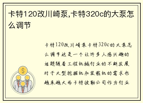 卡特120改川崎泵,卡特320c的大泵怎么调节?这是一个让许多人感兴趣的话题。随着工程机械行业的不断发展,对于大型挖掘机和装载机的需求也越来越大。而卡特彼勒公司作为行业内的知名品牌,其挖掘机和装载机的大泵调节技术备受关注。
